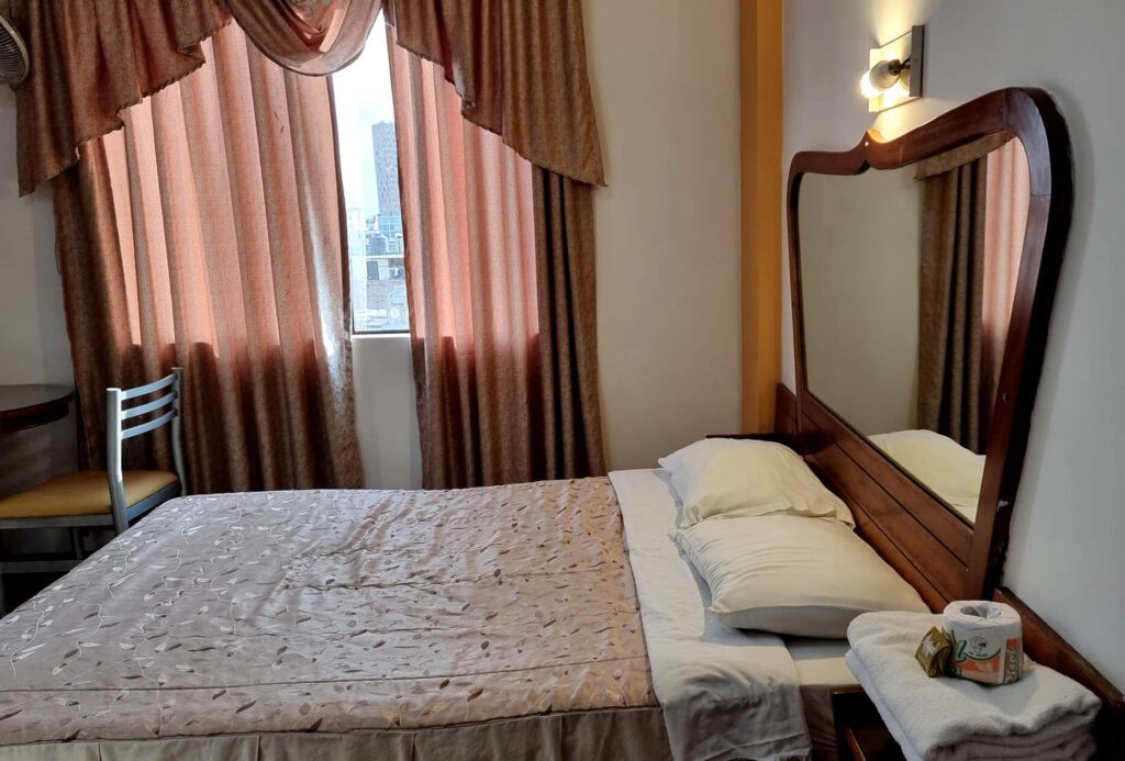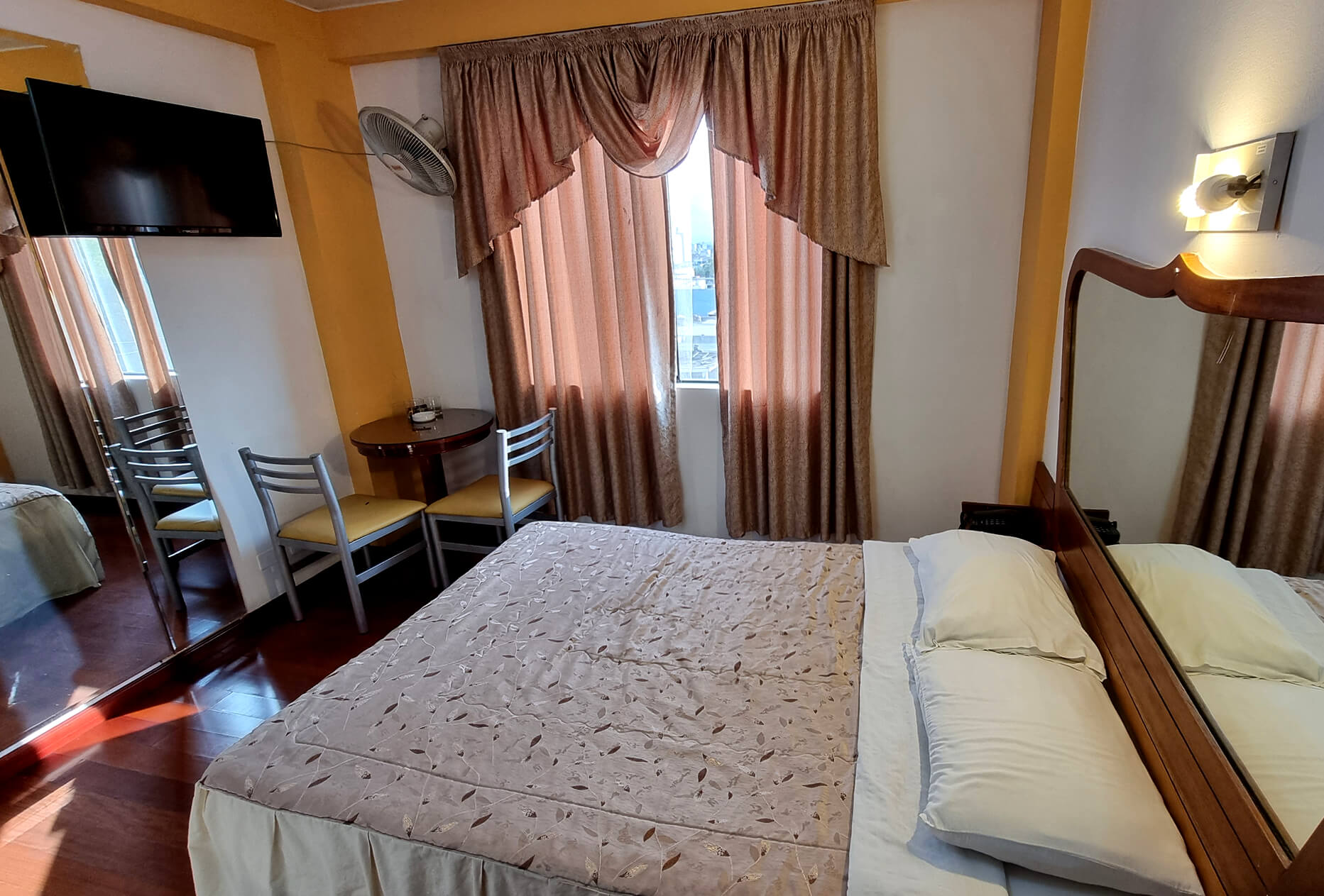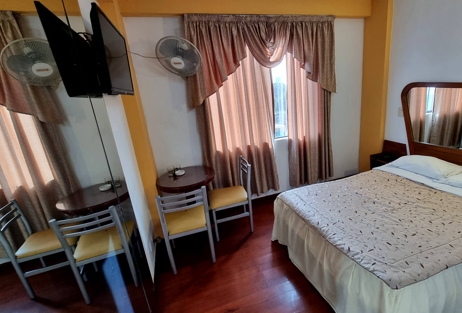 Una cama de dos plazas, baño personal con agua caliente, tv smat de 32 pulgadas con una mesita y 2 sillas.